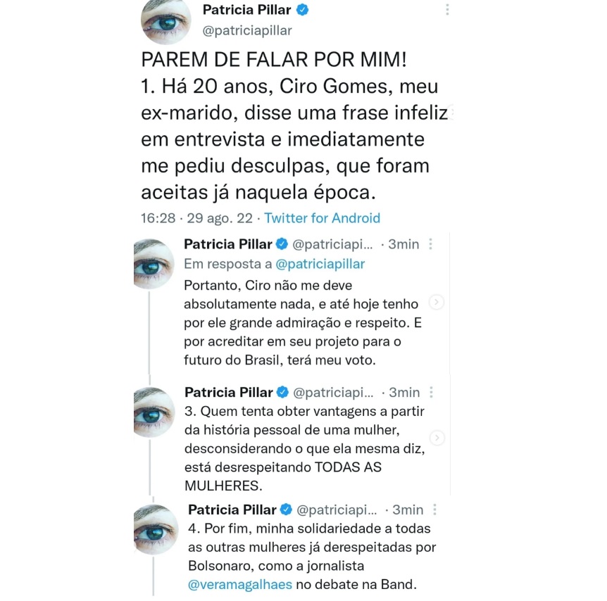 1. Há 20 anos, Ciro Gomes, meu ex-marido, disse uma frase infeliz em entrevista e imediatamente me pediu desculpas, que foram aceitas já naquela época. Portanto, Ciro não me deve absolutamente nada, e até hoje tenho por ele grande admiração e respeito. E por acreditar em seu projeto para o futuro do Brasil, terá meu voto.