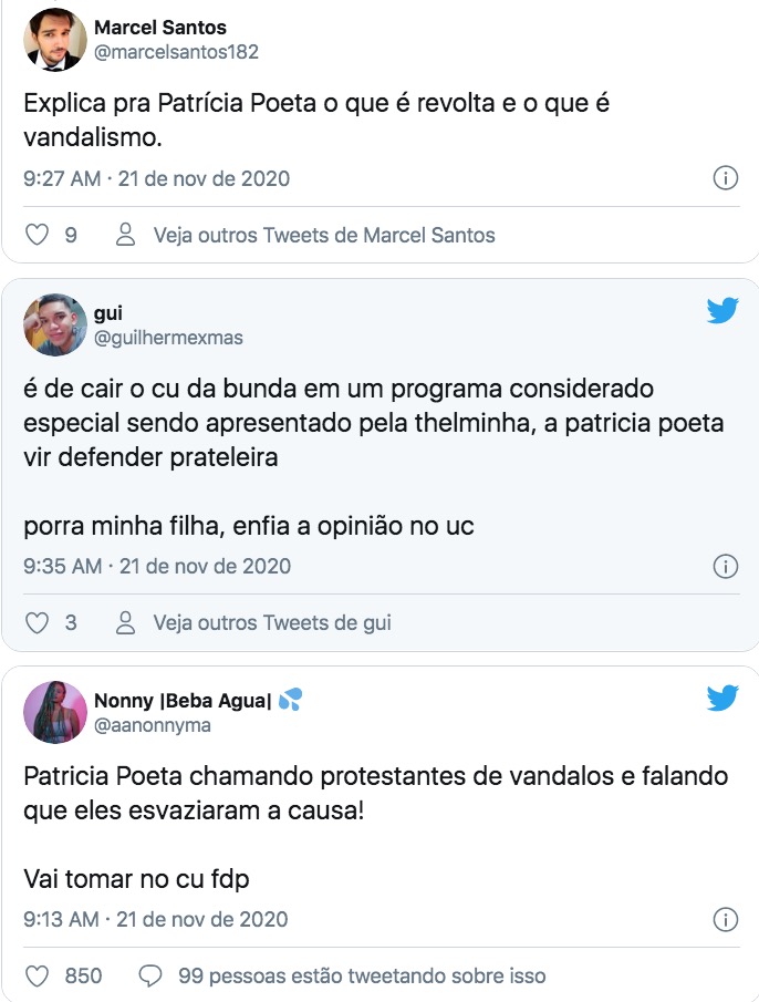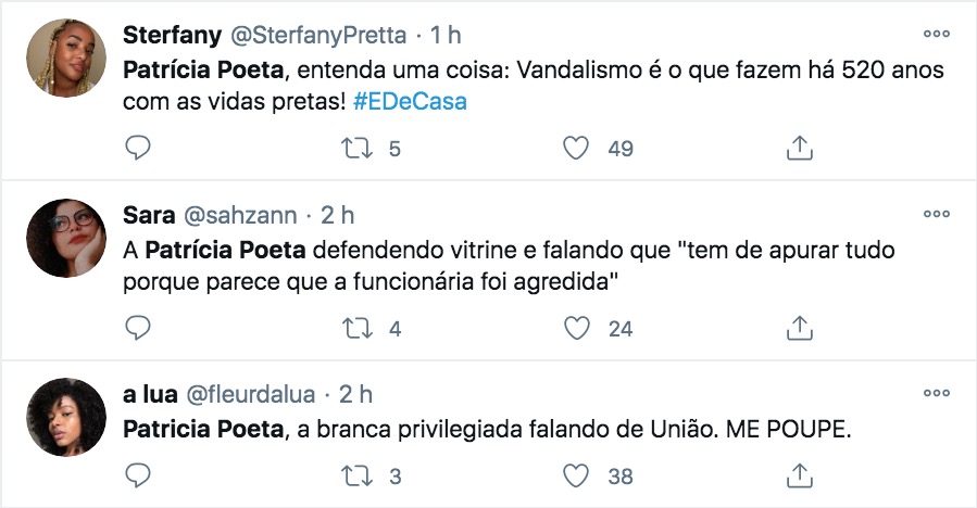 A apresentadora Patrícia Poeta está sendo detonada nas redes sociais após dizer durante o programa “É De Casa”, deste sábado (21) que houve “vandalismo” e “intolerância” nos protestos raciais por conta do assassinato de João Alberto.