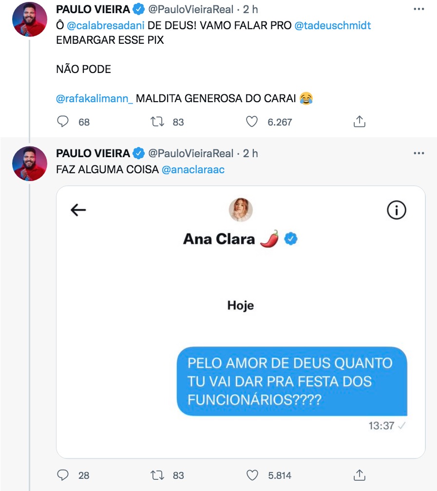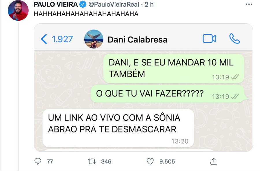 Paulo ainda mostrou prints de uma conversa com Dani Calabresa e afirmou que os dois estavam desesperados.