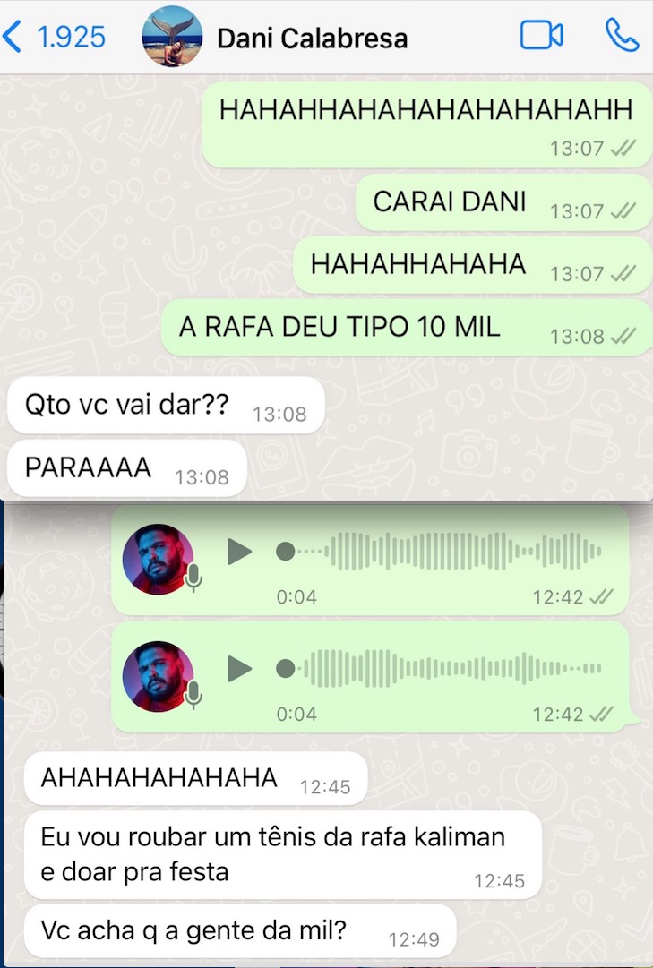 “Eis que a primeira a doar foi Rafa Kalimann e… MERMÃO… A Rafa deu 10 mil, 10 mil!!”, disse com GIFS de espanto.