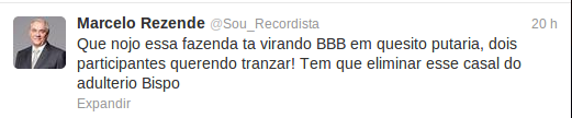 Pelo Twitter, o apresentador do "Cidade Alerta" criticou a atração do próprio canal e chegou a compará-lo ao Big Brother Brasil, reality da rede Globo, no quesito "putaria".