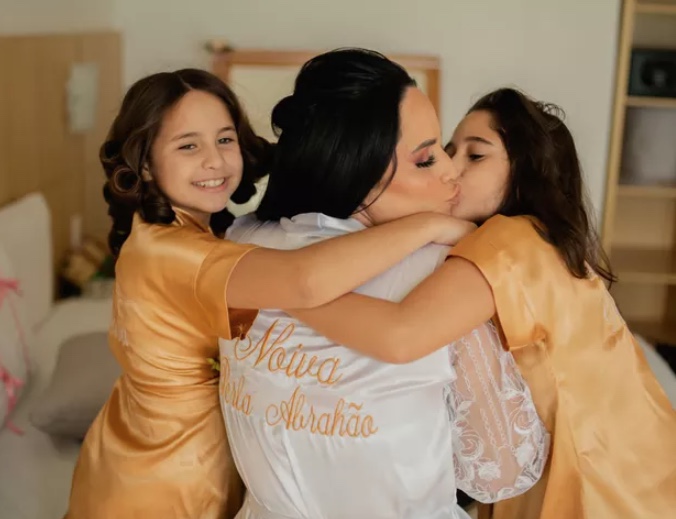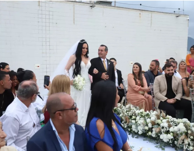 Perlla entrou ao som da marcha nupcial, usando um vestido da estilista Lu Rodrigues com cauda semi-sereia e mangas longas transparentes com rendas. As filhas de Perlla Pérola, de 10 anos e Pietra, de 9, foram daminhas de honra e levaram as alianças dos noivos, da marca Bvlgari, avaliadas em R$ 132 mil, em ouro amarelo 18K com espiral cravejada e pavê de diamantes nas bordas.