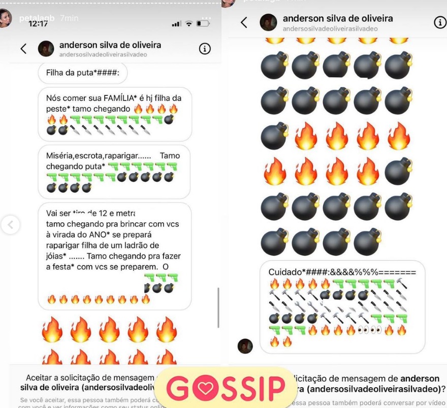 Nas mensagens, um perfil afirma que ela está “falando demais” e que ela e sua família “vão pagar o pato”. A pessoa faz ofensas e ameaças contínuas: “cuidado por onde você e sua família andar, a tropa tá de olho. Nós vamos (ocultado) vc hoje otária, vc já falou demais, se preparem a tropa tá chegando. Nós comer sua FAMÍLIA é hj filha da peste, tamo chegando. Vai ser tiro de 12 e metralhadora, tamo chegando pra brincar com vcs à virada do ano, se preparem”.