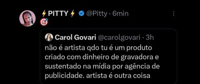 Pitty mandou uma suposta indireta a Juliette Freire no Twitter nesta quinta-feira (19) e depois apagou o post. Com um emoji de "acerto no alvo", a cantora compartilhou um tuíte que dizia “Não é artista quando tu é um produto criado com dinheiro de gravadora e sustentado na mídia por agência de publicidade. artista é outra coisa”.