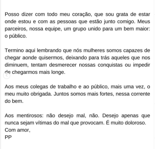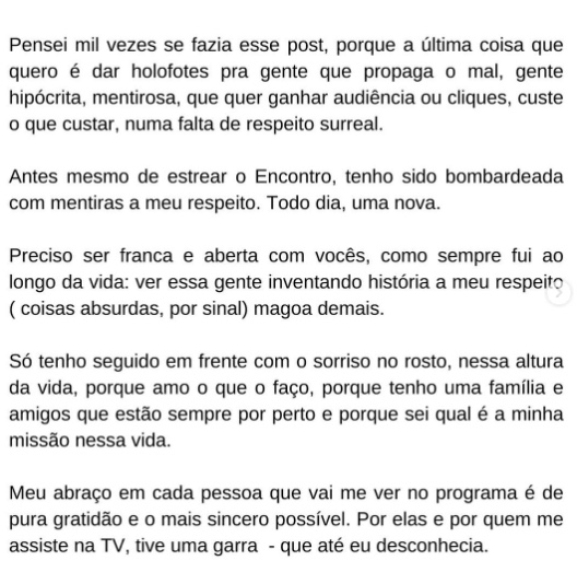 A apresentadora disse que não se importa com as críticas que recebe pelo seu desempenho no programa, mas que não vai mais aceitar as "mentiras e especulações" que andam circulando sobre os bastidores. Leia na íntegra a nota publicada pela apresentadora.