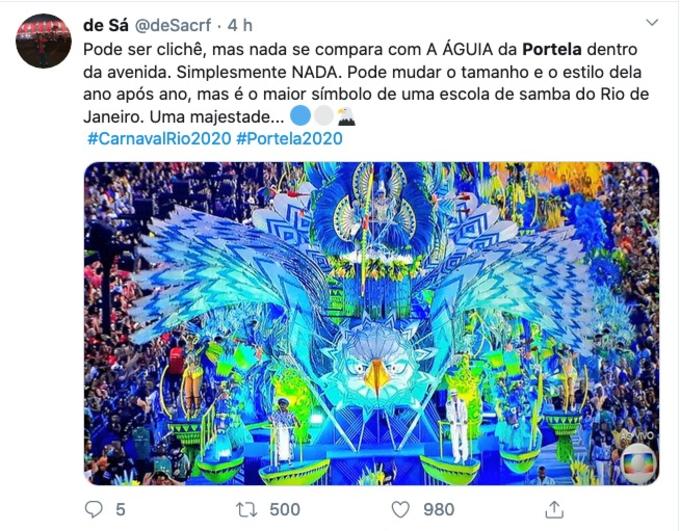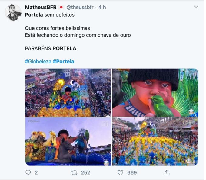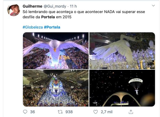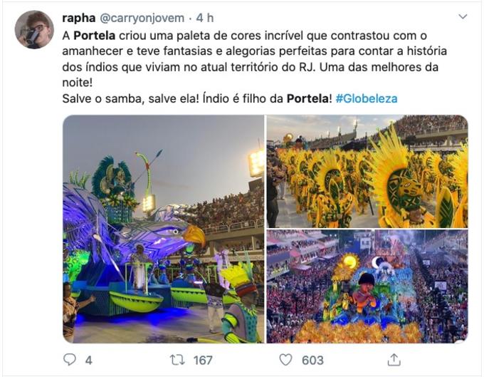 Com um enredo sobre os tupinambás e o paraíso, a Portela encerrou a primeira noite dos desfiles do grupo Especial do Rio de Janeiro. A escola mais vitóriosa do Carnaval, arrancou elogios dos internautas, e é o desfile mais comentado do Twitter.