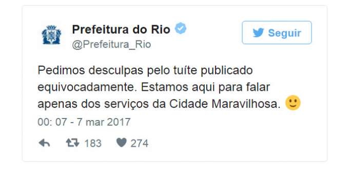 O tuíte equivocado foi apagado e houve um pedido de desculpas: "Pedimos desculpas pelo tuíte publicado equivocadamente. Estamos aqui para falar apenas dos serviços da Cidade Maravilhosa". Mas os internautas não perdoaram.