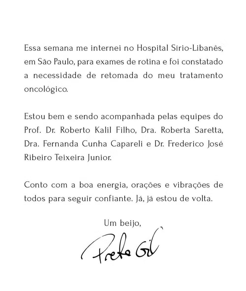"Essa semana me internei no Hospital Sírio-Libanês, em São Paulo, para exames de rotina e foi constatado a necessidade de retomada do meu tratamento oncológico. Estou bem acompanhada pelas equipes do Prof. Dr. Roberto Kalil Filho, Dra. Roberta Saretta, Dra. Fernanda Cunha Capareli e Dr. Frederico José Ribeiro Teixeira Junior. Conto com a boa energia, orações e vibrações de todos para seguir confiante. Já, já estou de volta", disse ela nas redes sociais.