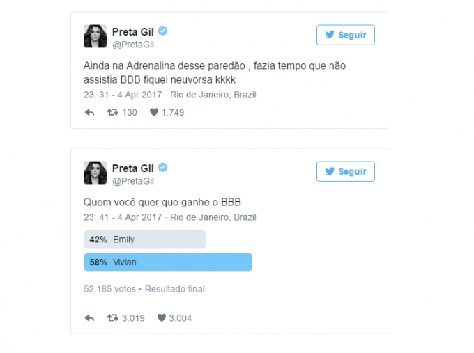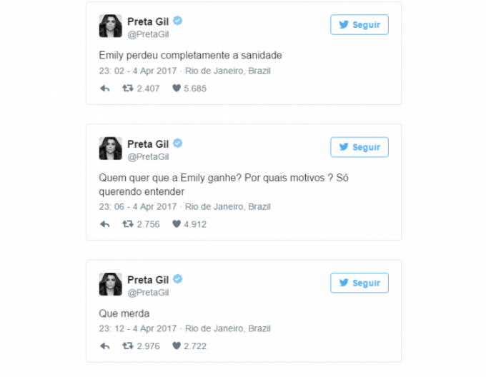 Logo após a saída de Ilmar, ela fez comentários sobre os rumos do programa no Twitter. A cantora se disse a Emilly perdeu a sanidade. Preta Gil fez uma enquete de quem ganharia o BBB 17, Emilly ou Vivian.