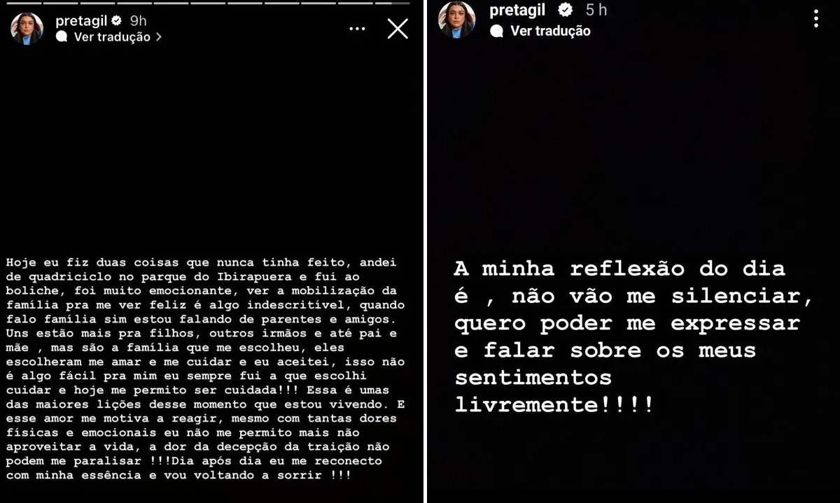 "Esse amor me motiva a reagir, mesmo com tantas dores físicas e emocionantes. Não me permito mais não aproveitar a vida. A dor da decepção da traição não pode me paralisar. Dia após dia eu me reconecto com minha essência e vou voltando a sorrir", finalizou.