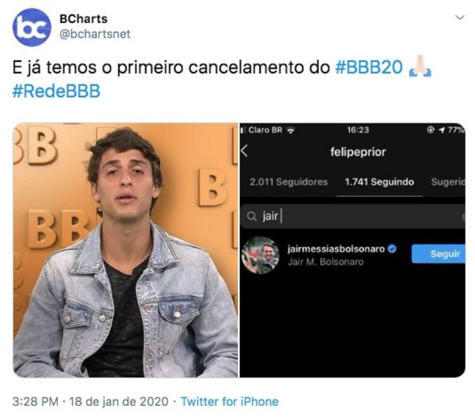 Logo após as críticas, o perfil de Felipe nas redes sociais deixou de seguir Bolsonaro.