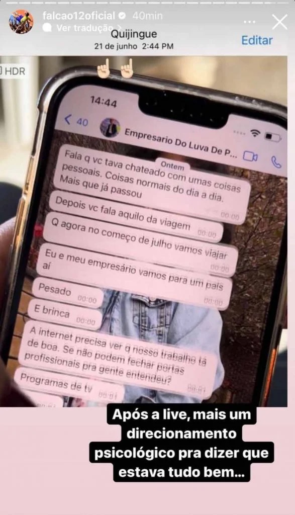 “Fala que você estava chateado com umas coisas pessoais, coisas normais do dia a dia, mas que já passou. Depois você fala aquilo da viagem, que agora no começo de julho vamos viajar. ‘Eu e meu empresário vamos para um país aí’”, diz.