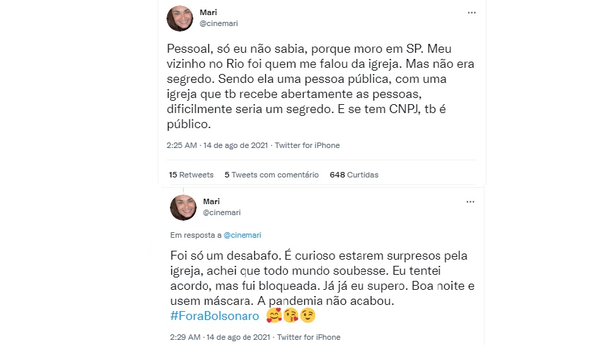 “Foi só um desabafo. É curioso estarem surpresos pela igreja, achei que todo mundo soubesse. Eu tentei acordo, mas fui bloqueada. Já já eu supero. Boa noite e usem máscara. A pandemia não acabou. #ForaBolsonaro”, continuou a produtora.