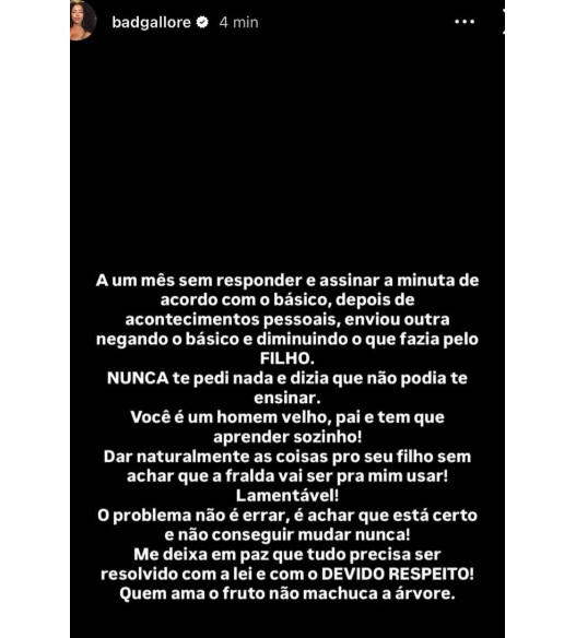 “Há um mês sem responder e assinar a minuta de acordo com o básico... Você é um homem velho, pai, e tem que aprender sozinho! Dar naturalmente as coisas pro seu filho sem achar que a fralda vai ser pra mim [sic] usar! Lamentável! O problema não é errar, é achar que está certo e não conseguir mudar nunca! Me deixa em paz que tudo precisa ser resolvido com a lei e com o devido respeito! Quem ama o fruto não machuca a árvore”, escreveu Lore.