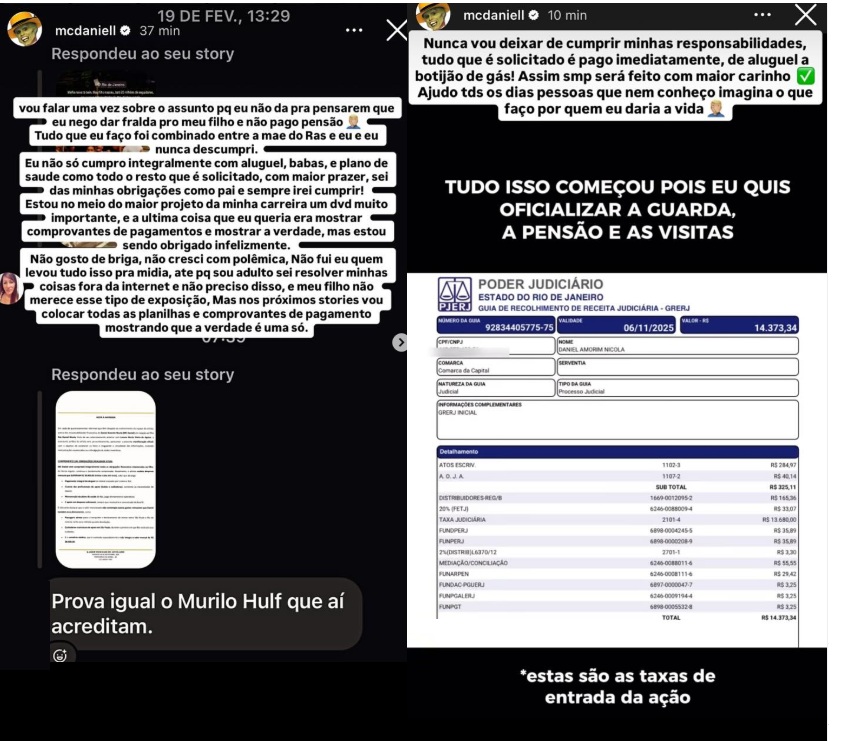 A disputa entre MC Daniel e Lorena Maria em questões envolvendo o filho do ex-casal, Rás, ganhou força nas redes sociais nesta quinta-feira (23). Após a repercussão de que Lorena entraria com uma ação acusando o ex de não cumprir suas obrigações financeiras na criação do filho, MC Daniel foi às redes sociais e afirmou que cumpre integralmente suas responsabilidades como pai.