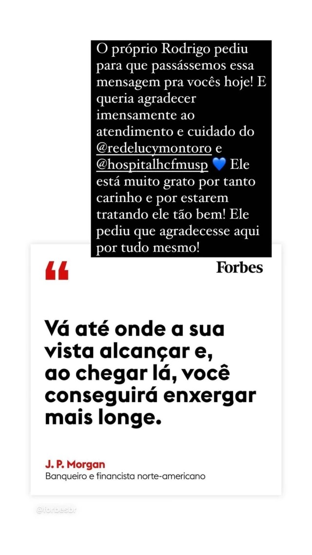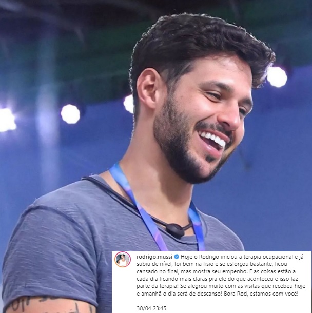 "O próprio Rodrigo pediu para que passássemos essa mensagem para vocês hoje! E queria agradecer imensamente ao atendimento e cuidado da Rede Lucy Montoro e do Hospital das Clínicas. Ele está muito grato por tanto carinho e por estarem tratando ele tão bem! Ele pediu que agradecesse por tudo mesmo!", publicou a equipe do rapaz no Instagram.