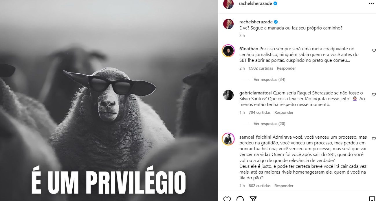 "Quem seria Raquel Sherazade se não fosse o Silvio Santos? Que coisa feia ser tão ingrata desse jeito! Ao menos então tenha respeito nesse momento", comentou outra pessoa.