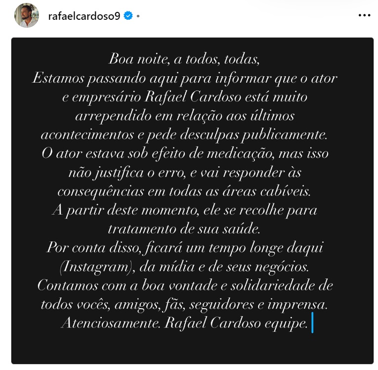 "Boa noite, a todos, todas. Estamos passando aqui para informar que o ator e empresário Rafael Cardoso está muito arrependido em relação aos últimos acontecimentos e pede desculpas publicamente.