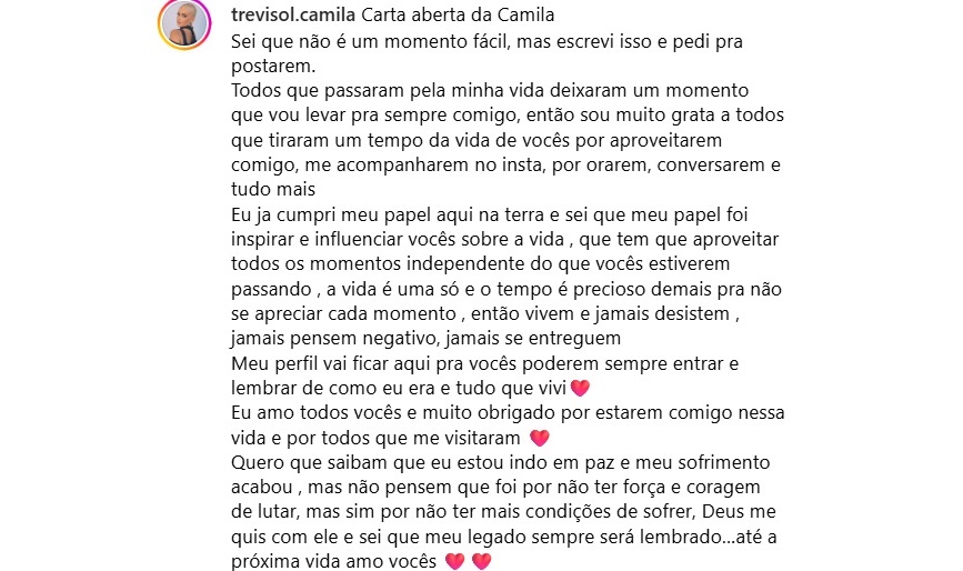O velório acontece nesta quarta-feira, em sua cidade natal, Americana, no interior de São Paulo. Em suas palavras de despedida, a jovem agradeceu a todos que estiveram ao seu lado ao longo da jornada. Confira abaixo.