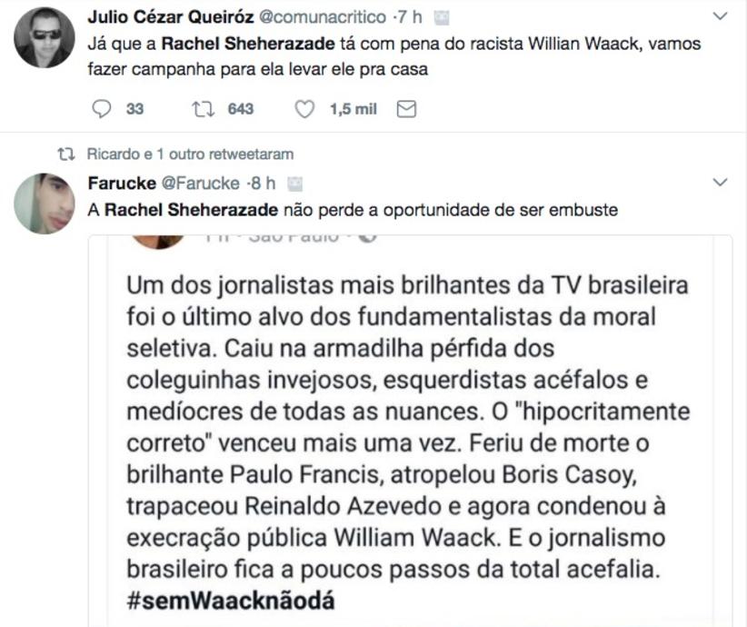 “Já que a Rachel Sheherazade tá com pena do racista Willian Waack, vamos fazer campanha para ela levar ele pra casa”, disse um internauta se referindo a uma antiga polêmica da jornalista.