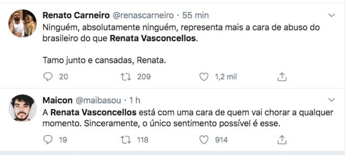 A expressão de Renata, com um ar de tristeza, foi notada pelos internautas, colocando o nome da apresentadora nos trending topics do Twitter. Confira alguns dos comentários: