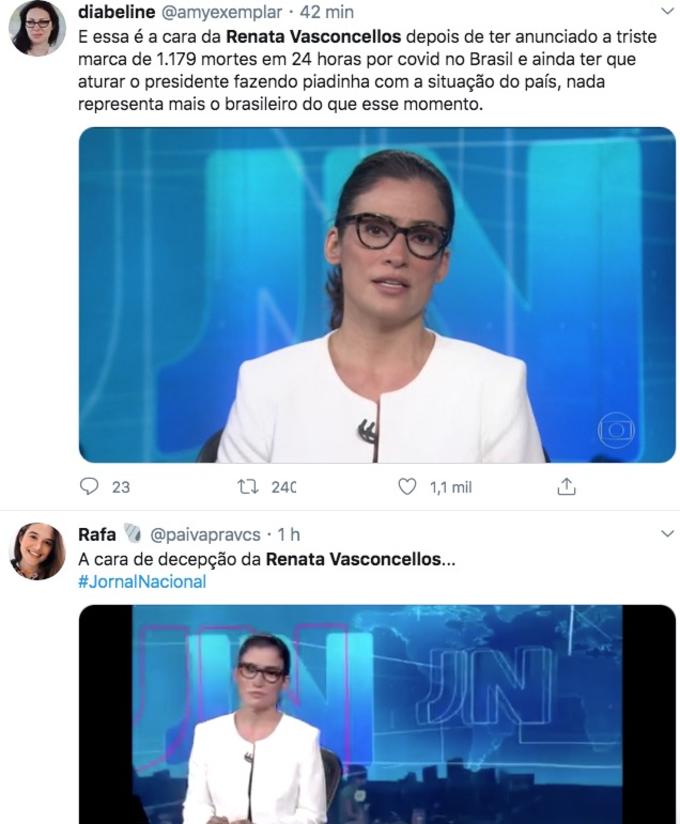 Renata Vasconcellos não conseguiu disfarçar a sua reação após o Jornal Nacional veicular a piada que o presidente da República Jair Bolsonaro fez, na noite desta terça-feira (19), destacando o dia em que o Brasil atingiu pela primeira vez a marca de mais de 1 mil mortes por coronavírus em 24 horas.