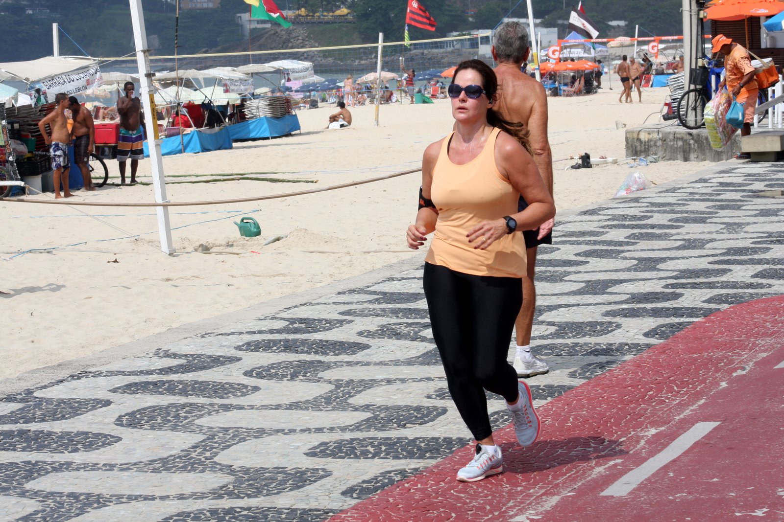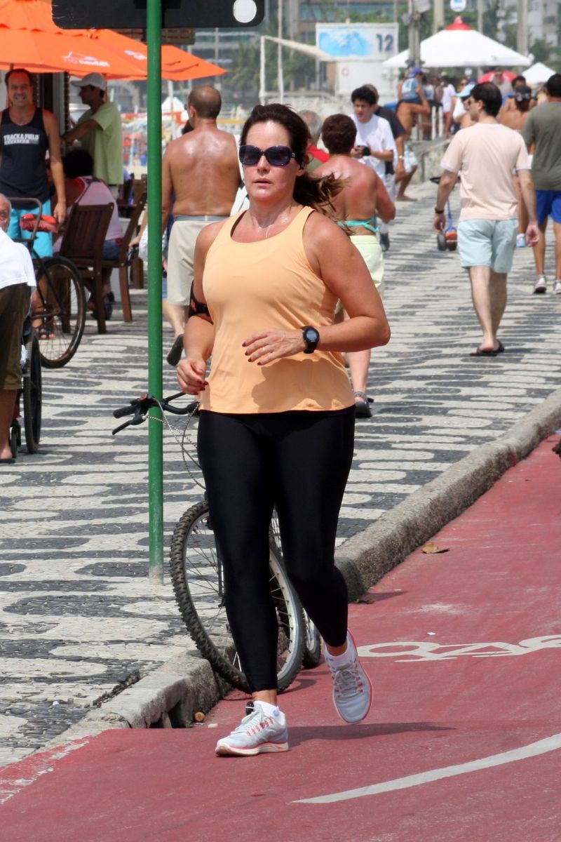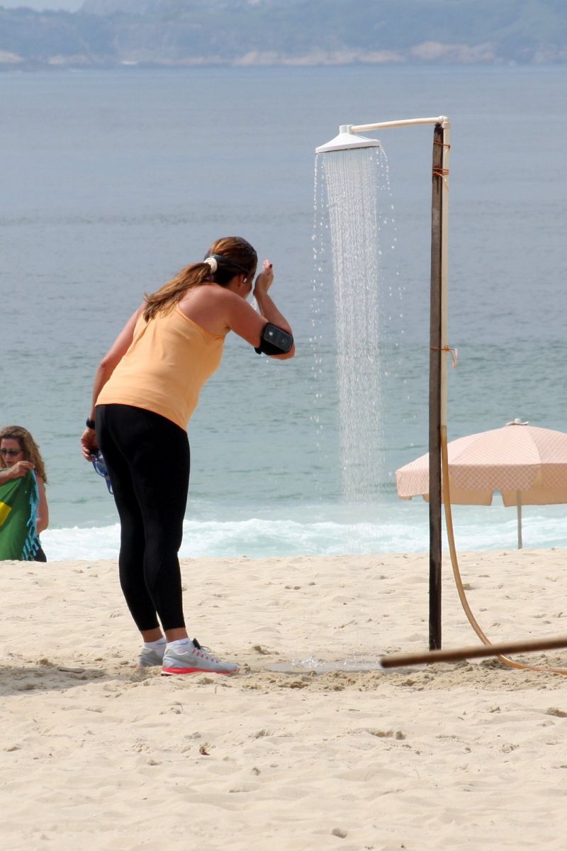 Renata Ceribelli já participou do quadro 'Medida Certa', no Fantástico (TV Globo), mas continua suando a camisa para entrar em forma. A jornalista e apresentadora correu sozinha na orla do Leblon, na Zona Sul do Rio de Janeiro. No sábado de verão carioca, Renata aproveitou para se refrescar no chuveirinho durante uma pausa dos exercícios.