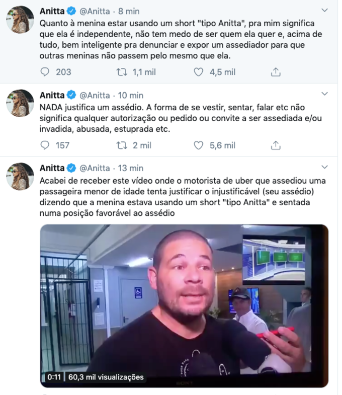 “Acabei de receber este vídeo onde o motorista de uber que assediou uma passageira menor de idade tenta justificar o injustificável (seu assédio) dizendo que a menina estava usando um short "tipo Anitta" e sentada numa posição favorável ao assédio”, escreveu ela no Twitter.