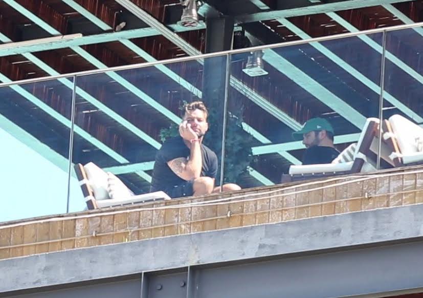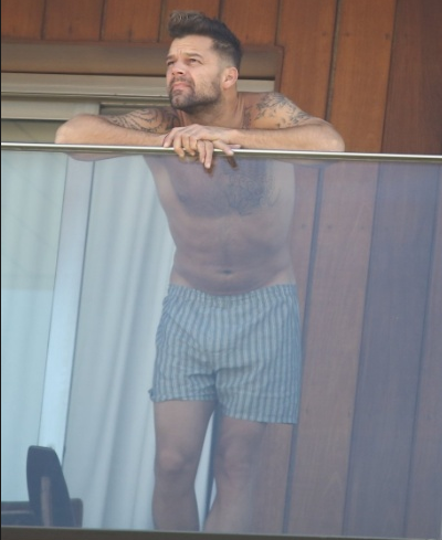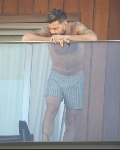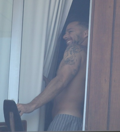 Sem camisa, Ricky Martin é fotografado na varanda de seu quarto em hotel na praia de Ipanema, no Rio de Janeiro. O cantor está no Brasil para gravar cenas do videoclipe de "We Are One", música da Copa do Mundo que gravou ao lado de Claudia Leitte, Pitbull e Jennifer Lopez.