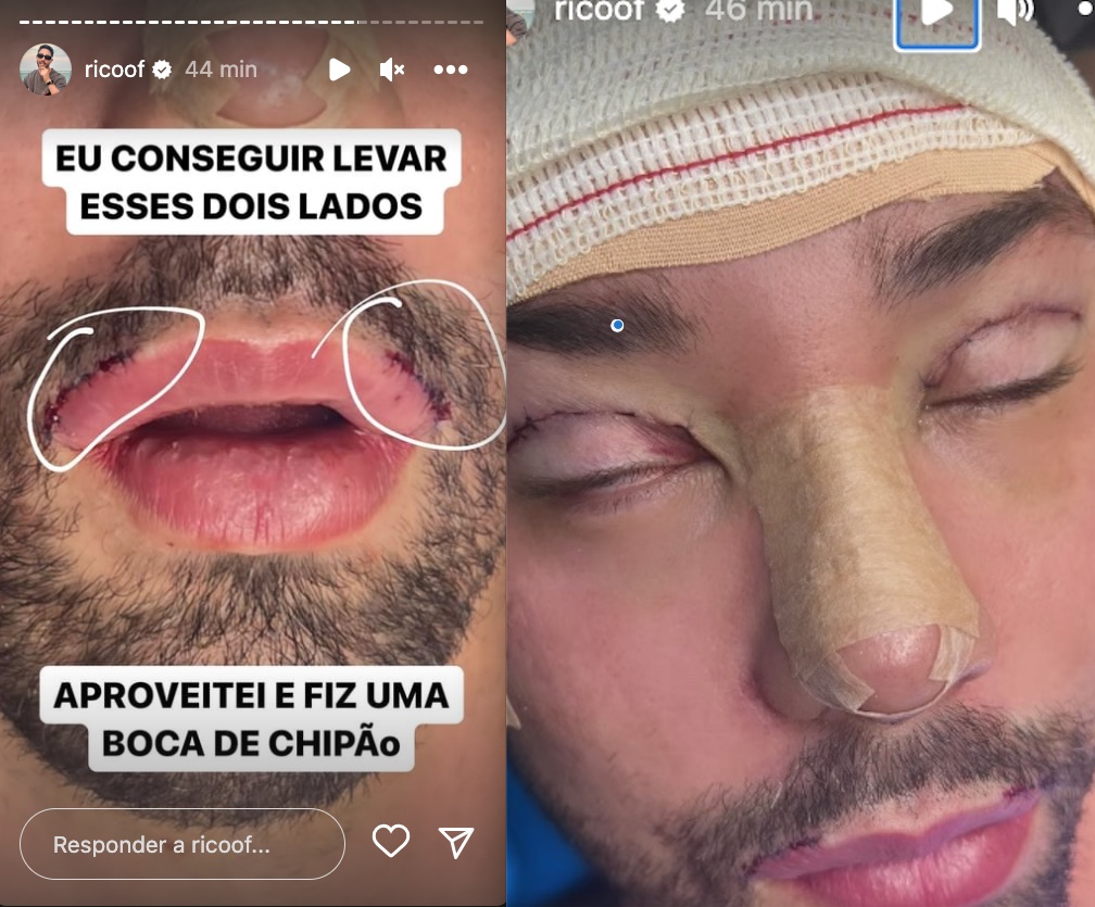 Rico mostrou o rosto cheio de cortes e enfaixado, e disse que se rendeu aos padrões que seus seguidores impõem no Instagram: "Deixa eu desabafar coom vocês, eu fiz esse procedimento de mudar porque eu não aguentava mais vocês me chamarem de feio no direct, e isso mexe muito comigo. Eu fiz esses procedimentos para seguir o padrão que a sociedade pede, infelizmente˜.