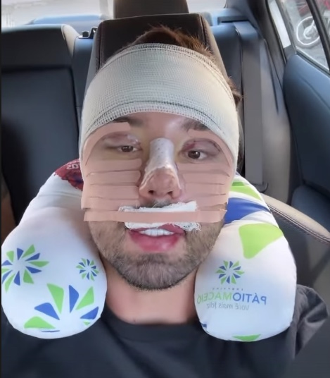 "E assim vamos começar a trocar de rosto", escreveu ele, mostrando os cortes nas pálpebras, nos lábios superiores e no nariz, além da testa e região da sobrancelha enfaixadas.