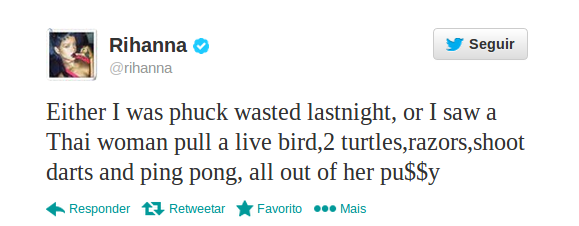"Ou estava totalmente bêbada ontem à noite, ou vi uma mulher tailandesa expulsar um pássaro vivo, duas tartarugas, facas, dardos e uma bola de pingue-pongue pela vagina", indicou em uma mensagem de 20 de setembro.