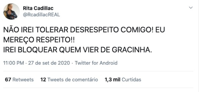 "Não irei tolerar desrespeito comigo. Eu mereço respeito. Irei bloquear quem vier de gracinha. Outra coisa, peçam foto para a mãe", escreveu ela.