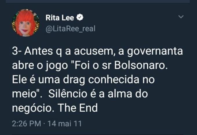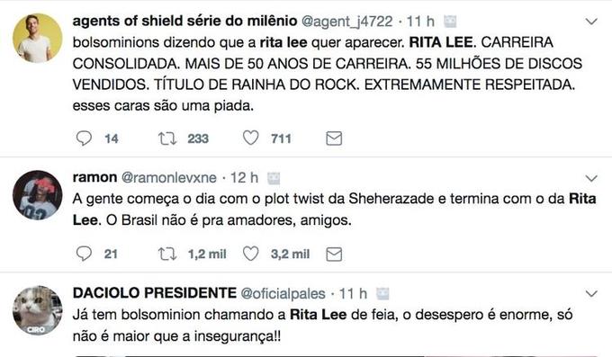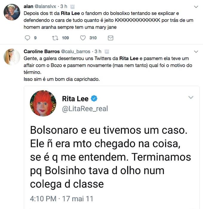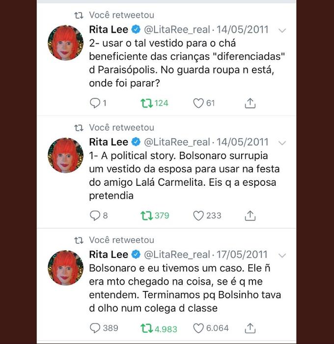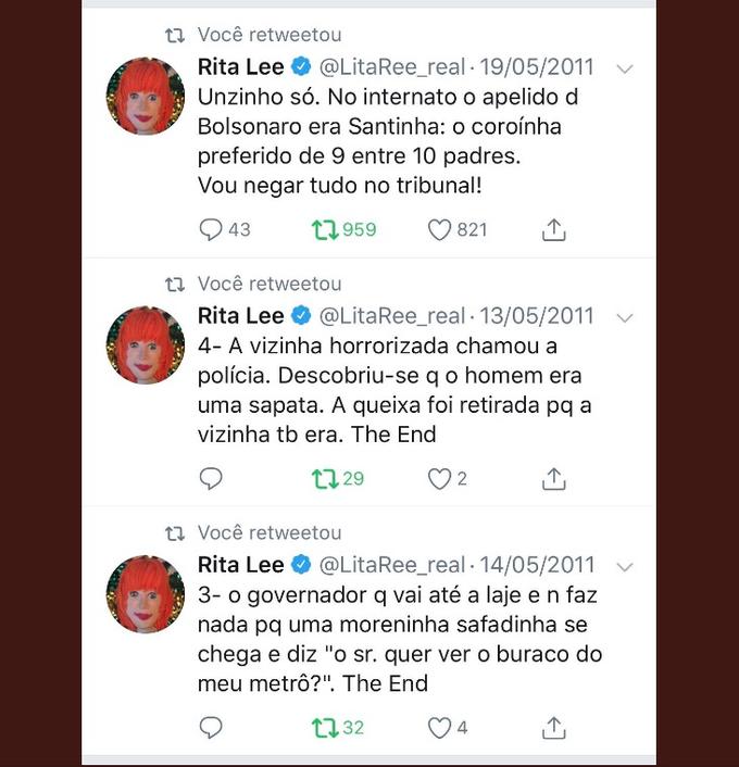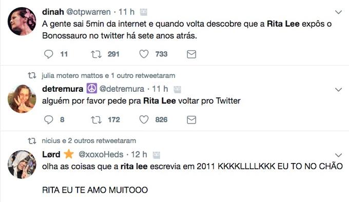 Rita Lee está dando o que falar nas redes sociais nesta quarta-feira (19). Isso porque internautas resgataram tuítes antigos da cantora mais precisamente de 2011 em que a cantora fala sobre o atual candidato à presidência.
