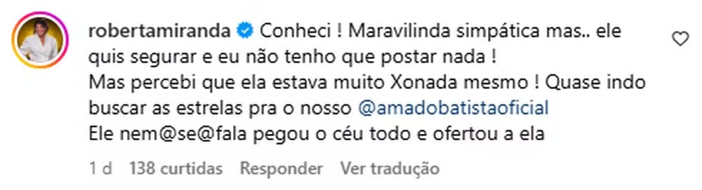 "Conheci a Calita! Ela é 'maravilinda', muito simpática, mas ele quis manter [o relacionamento] discreto e não cabe a mim postar nada! Mas deu para perceber que ela está muito 'xonada', mesmo! Quase pegando as estrelas para entregar ao nosso Amado Batista. E ele, então, nem se fala, já entregou o céu inteiro a ela", comentou Roberta em resposta a uma publicação sobre o romance.