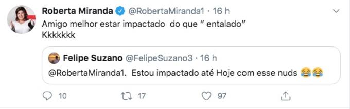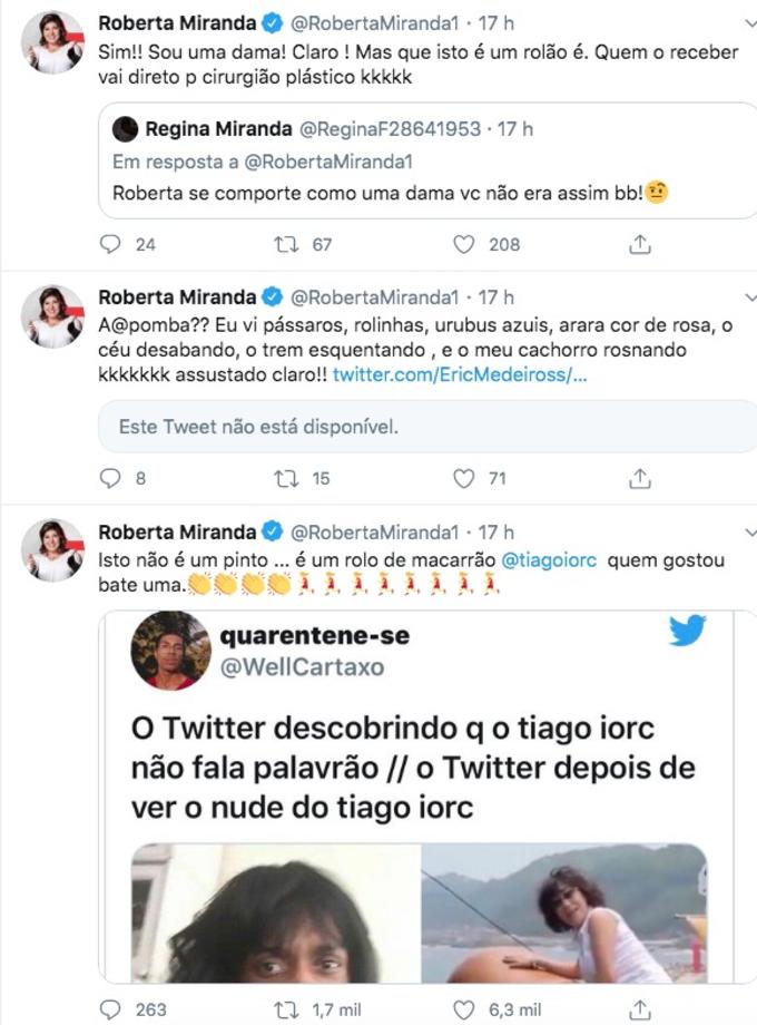 'Deu a louca' em Roberta Miranda após a cantora ver os supostos nudes vazados de Tiago Iorc. A artista fez diversos posts no Twitter sobre o assunto.