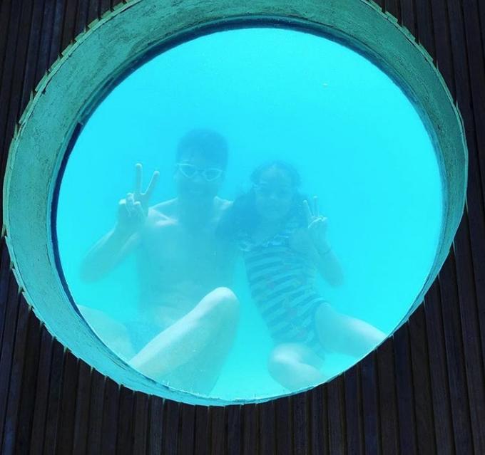 ''Domingo em casa'', escreveu Vera ao mostrar as rochas simulando pedras naturais. ''Mamãe @veraviel filmou a gente nadando pelo vidro da piscina aqui de casa!!!!'', escreveu Rodrigo em um dos registros.
