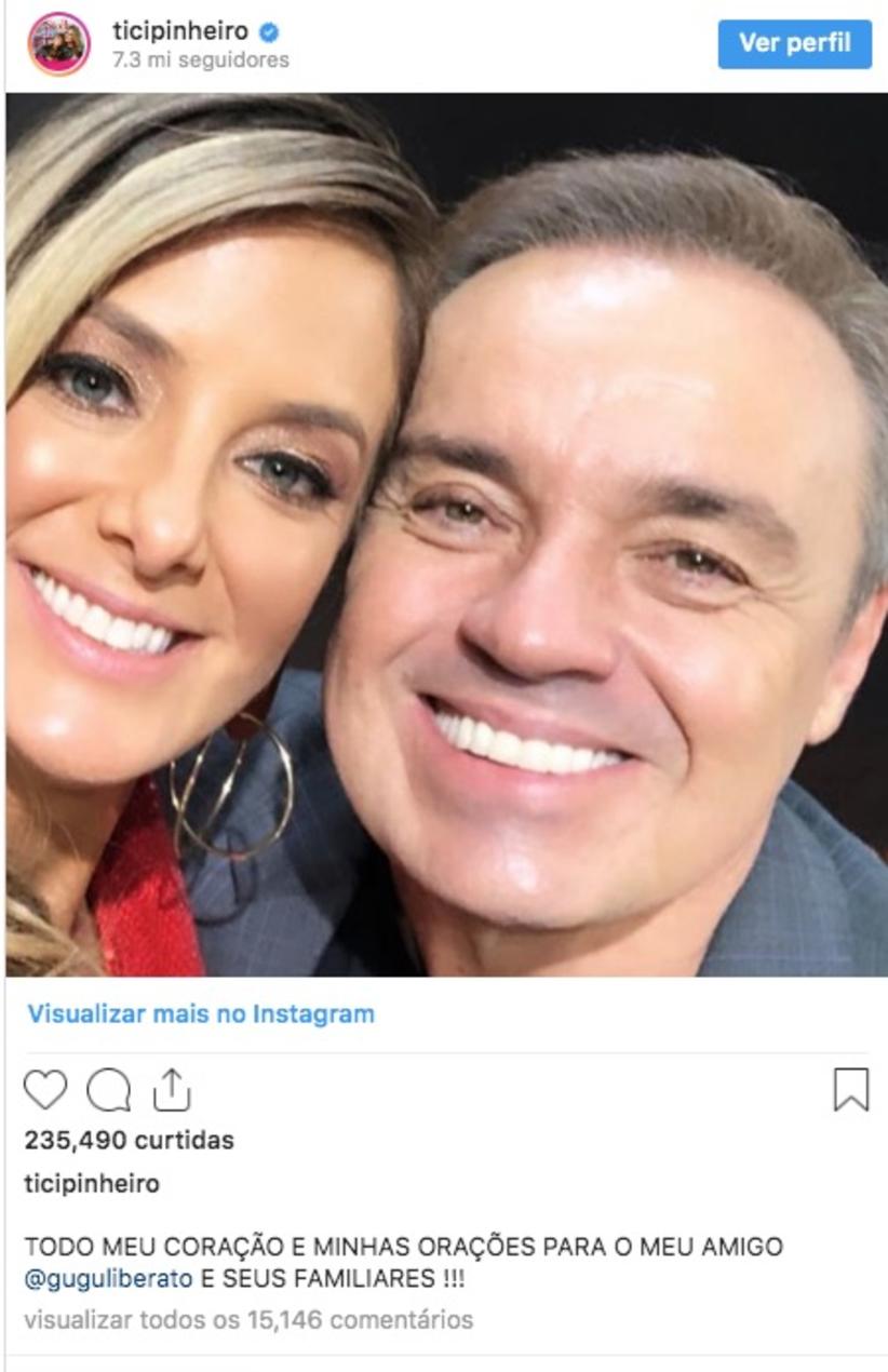 Ticiane Pinheiro não falou sobre a morte, mas disse estar orando por Gugu e se solidarizou com a família: "TODO MEU CORAÇÃO E MINHAS ORAÇÕES PARA O MEU AMIGO @guguliberato E SEUS FAMILIARES !!!".