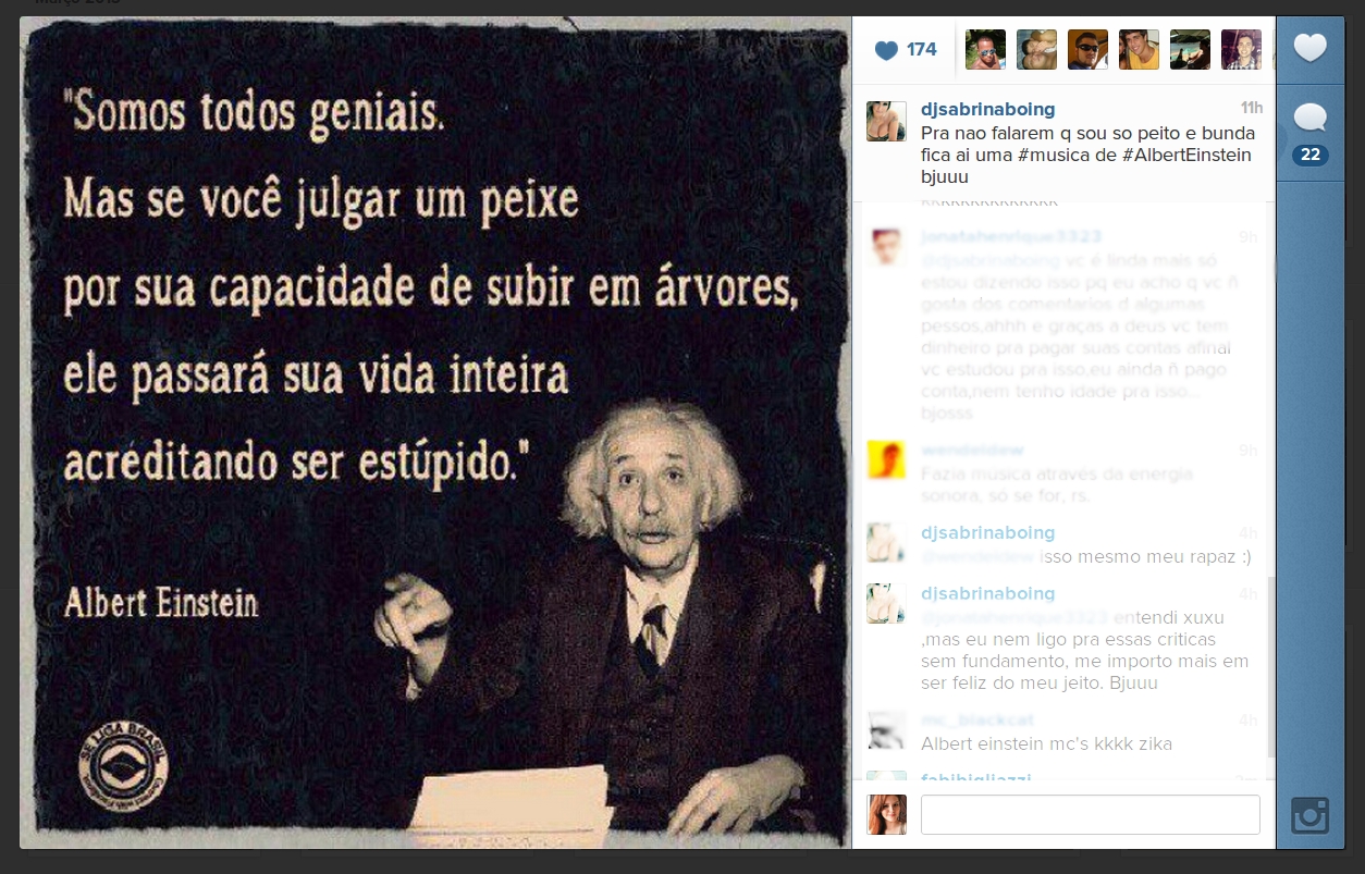 A DJ, conhecida por seus 3 litros de silicone em cada seio e por sempre posar sensual exibindo seus atributos generosos, publicou uma frase do físico e gênio alemão Albert Einstein e soltou a seguinte pérola na rede social: " Pra nao falarem q sou so peito e bunda fica ai uma #musica de @AlbertEinstein bjuuu "