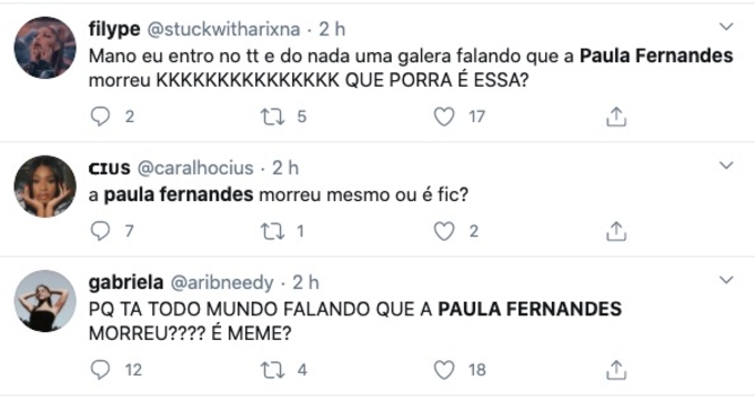 Em sua conta do perfil, Paula Fernandes se pronunciou sobre o assunto: "Que morri o que, uai? Tava lavando o cabelo...", comentou aos risos.