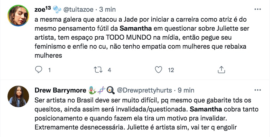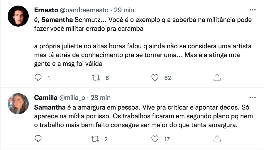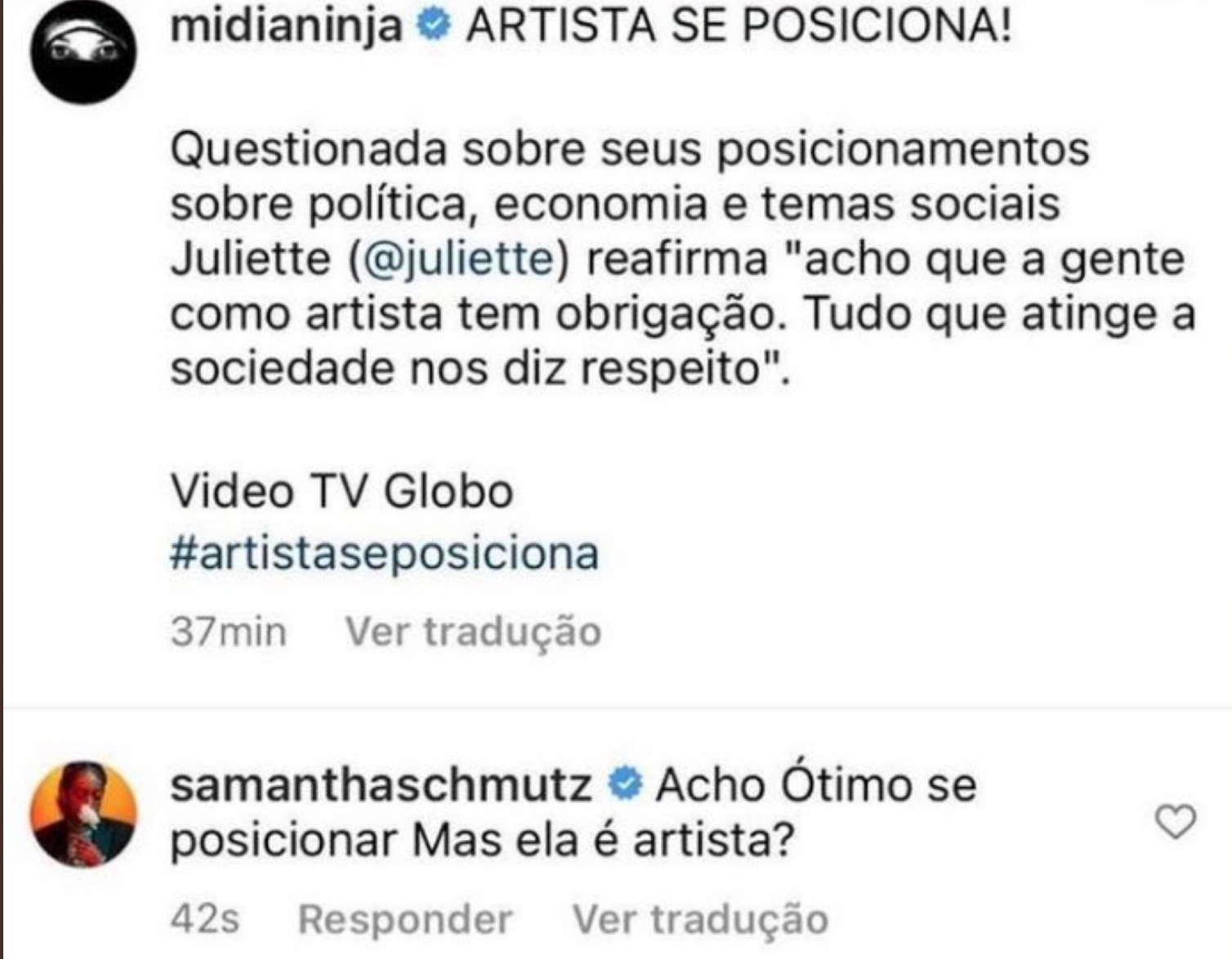 “Questionada sobre seus posicionamentos sobre política, economia e temas sociais, Juliette reafirma: ‘Tudo que atinge a sociedade nos diz respeito’” e defende a importância de artistas se posicionarem”, dizia o post. Samantha, então, comentou: “Acho ótimo se posicionar, mas ela é artista?”.