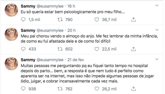 Desde então, Sammy vem mostrando que não está passando por maus bocados nas redes sociais, mas sem falar abertamente sobre o assunto. Ela chegou a postar uma foto com o rosto em lágrimas.