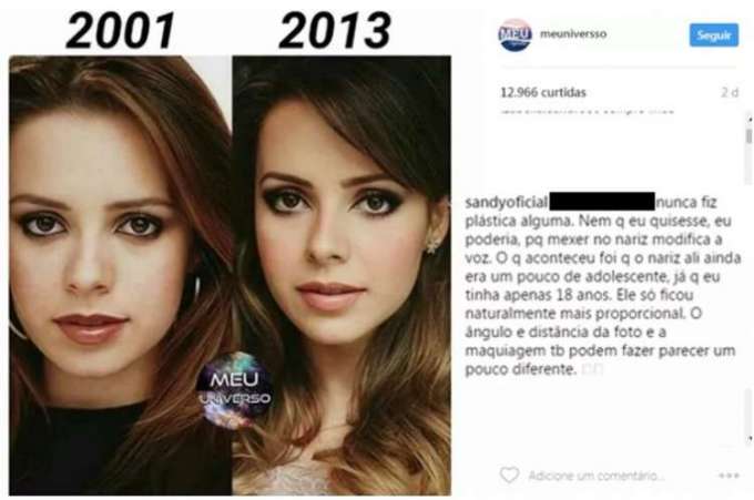 A artistas então resolveu rebater: “Nunca fiz plástica alguma. Nem que eu quisesse, eu poderia, porque mexer no nariz modifica a voz. O que aconteceu foi que o nariz ali ainda era um pouco de adolescente, já que eu tinha apenas 18 anos. Ele só ficou naturalmente mais proporcional. O ângulo e a distância da foto e a maquiagem também podem fazer parecer um pouco diferente”, explicou Sandy.
