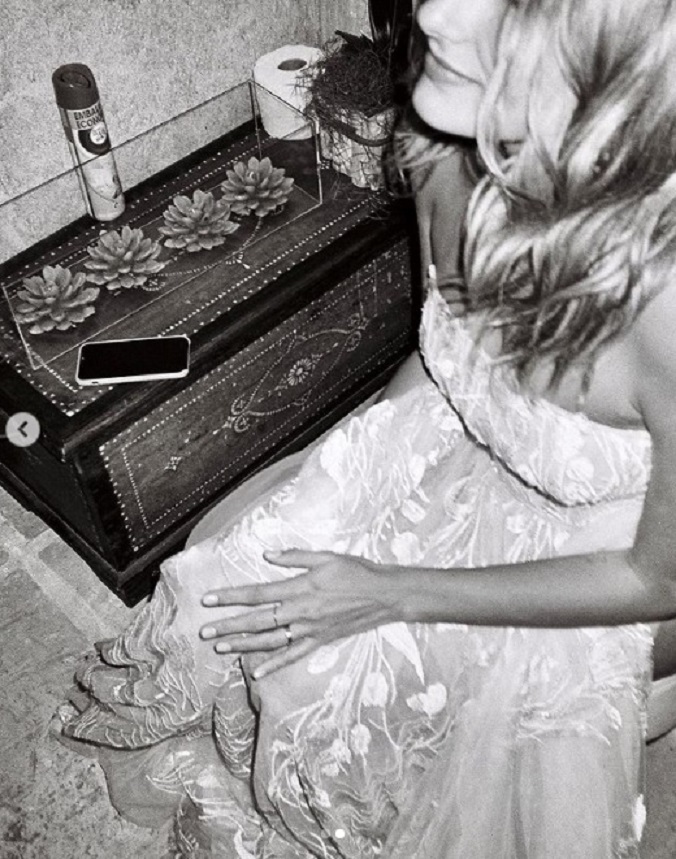 No clique feito pela fotógrafa Bruca Moreira, a modelo e estilista aparece sorridente, sentada ao vaso sanitário com o vestido de noiva. No clique postado em sequência, ela aparece 'limpando'.