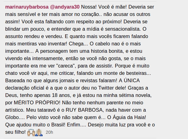 "Mas quem tem a família no comando da Globo não tem medo de nada, talvez por isso ela esteve tal (sic) segura p/ fazer essa escolha afinal acabei de ficar sabendo que ele já foi escalada pelo Benedito RUY BARBOSA p/ sua próxima novela, é.. A vida segue", disse a seguidora. Em resposta, Marina escreveu: