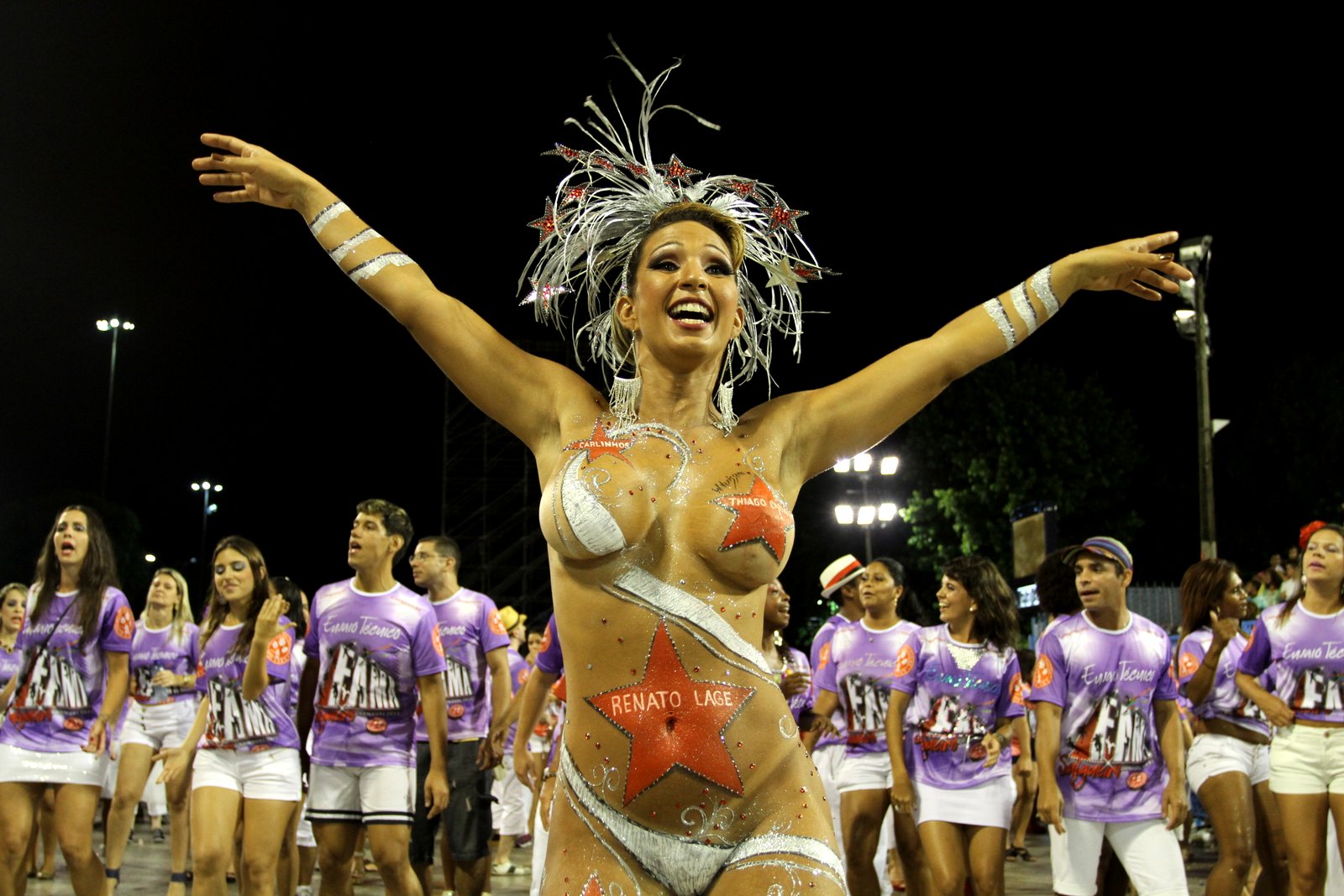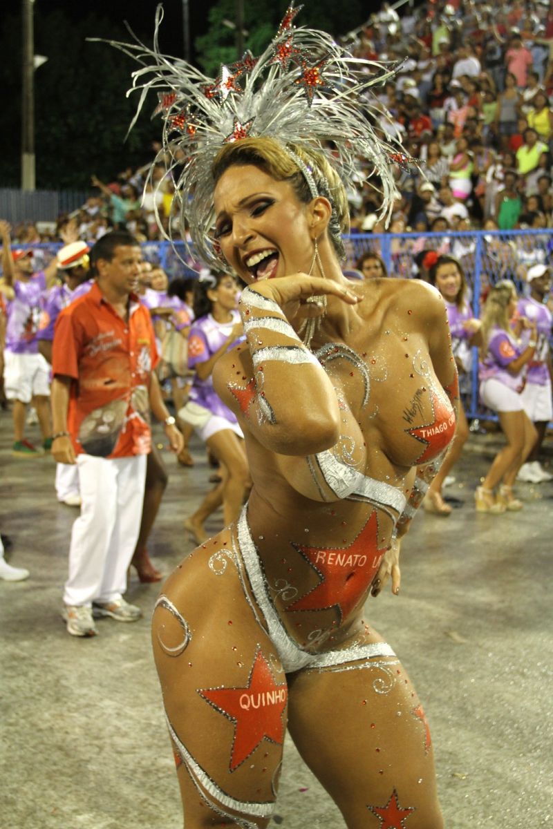 Valesca Popozuda mostrou os seus atributos no ensaio técnico da Salgueiro, que aconteceu neste domingo na Sapucaí. Sem roupa e apenas com tinta a 'cobrindo', a funkeira trouxe no corpo nomes de personalidades da escola.