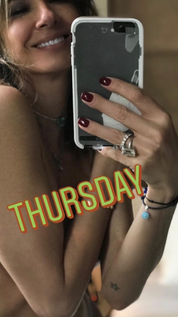 A apresentadora que está em Milão, na Itália, apareceu sem camisa, cobrindo os seios com as mãos, mostrando a barriga macérrima e completamente sarada.