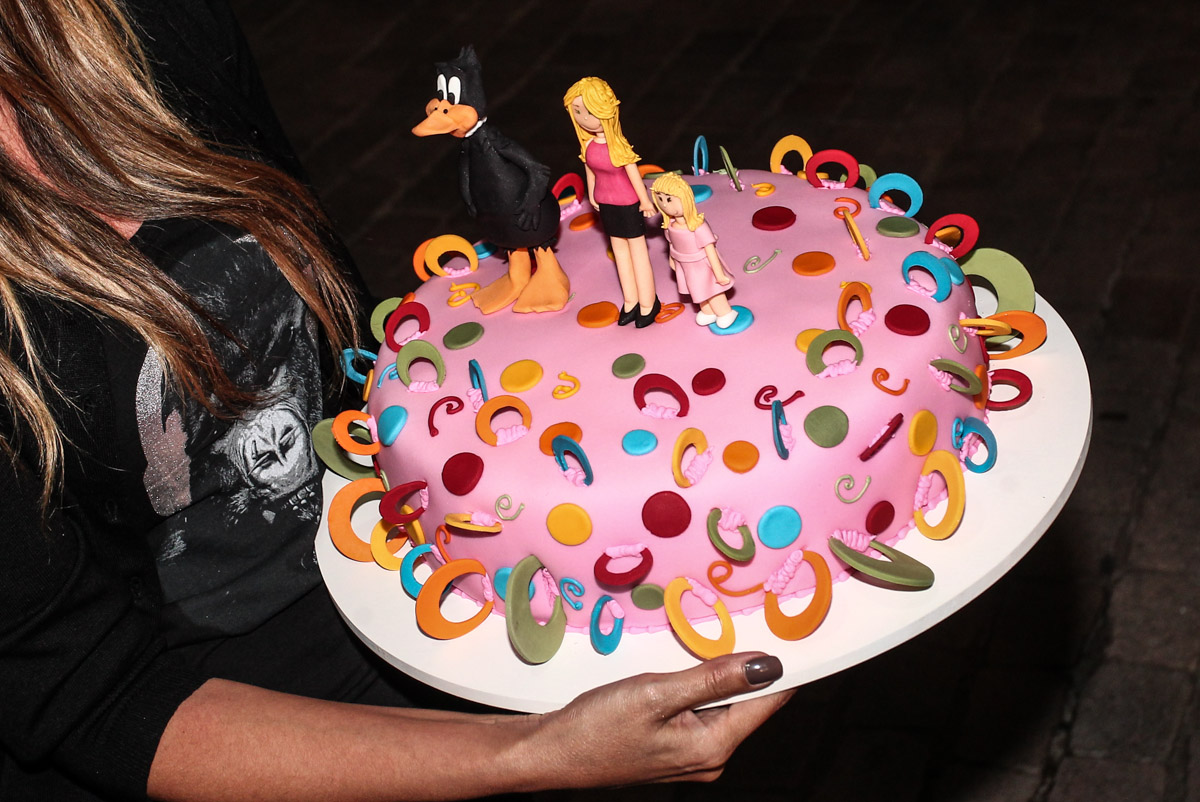O bolo do aniversário trouxe Ticiane e Rafaella, além do 'Patolino' ao lado.