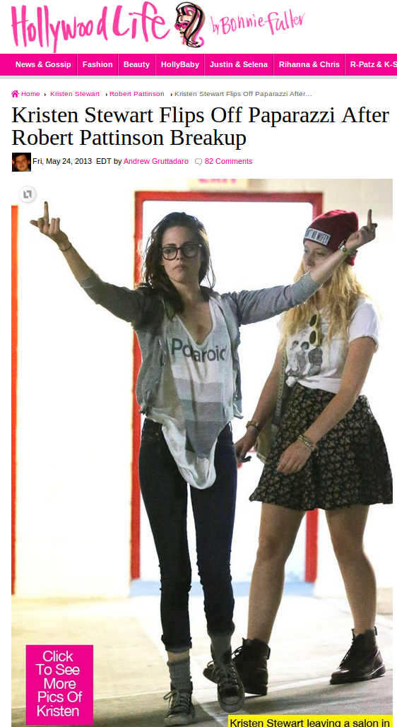 Durante a noite desta quinta-feira, 23, enquanto passeava com um grupo de amigas em Los Angeles, Kristen Stewart mostrou que perdeu a paciência com os paparazzi, e quando o fotógrafo apareceu a seguindo, a atriz mostrou o dedo do meio e foi fotografada à vontade, em vários ângulos, fazendo o gesto obsceno.