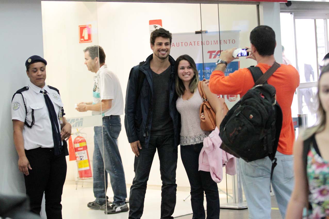 O ator que na minissérie da TV Globo "Corações Roubados" contracena com Ísis Valverde, apontada como pivô do fim do casamento de Cauã e Grazi, foi simpático e posou com vários fãs antes de entrar no saguão de embarque.